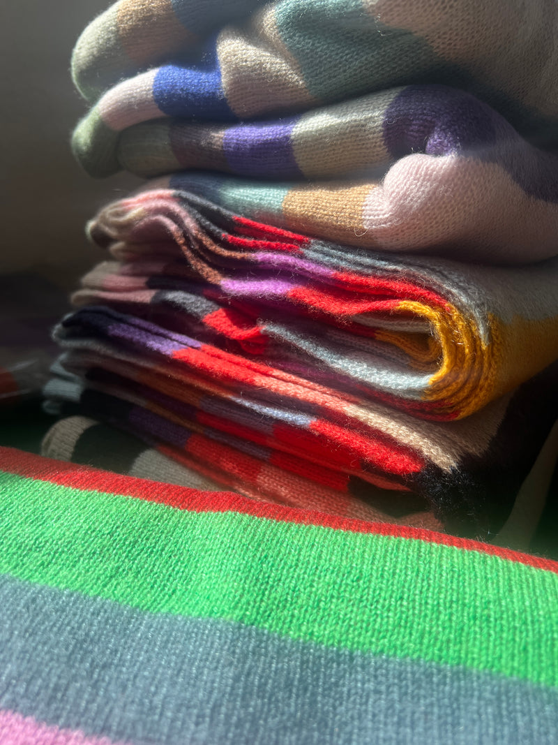 But our designs are more than just cosy cardigans or colourful scarves. By blending this exquisite material with bold colour and intricate pattern, we create unexpected pieces inspired by the jewel tones and traditional prints of Nepal—luxury with a story woven into every thread.
